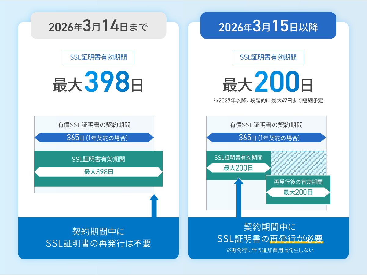 このたびの業界基準の変更により、発行されるSSL証明書の有効期間が200日以下に短縮されることから、